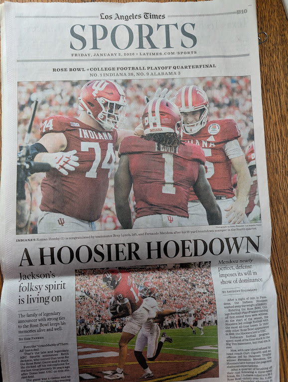 Every now and again, I look at the January 2, 2026 edition of the Los Angeles Times and just sit and smile. I didn’t just smile today when I thought about The Rose Bowl, I chuckled. You think Bill Curry knows that the current coach at Alabama got a raise and a contract extension today after his Tide team’s last game was a beat down handed to them by the Indiana Hoosiers? Context, my friends, context. Times change. Indiana proved that.