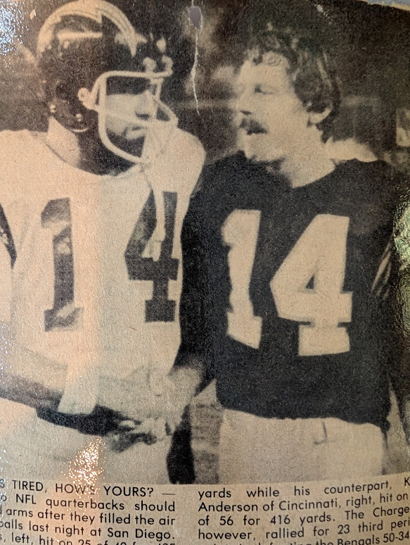 This 1982 Monday Night Football shoot-out between the Bengals saw Anderson throw for 416 yards and Dan Fouts of the Chargers throw for 425 yards.