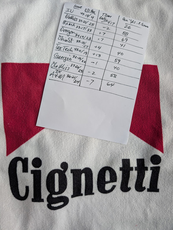 Above from left to right you will find each team’s average score/ number of first downs given up by penalty/ turnover ratio/ yards penalized per game. The Indiana Hoosiers play the game better than any other team plays the game. You can’t make this stuff up. Coach Curt Cignetti has led the greatest turnaround in college sports history.